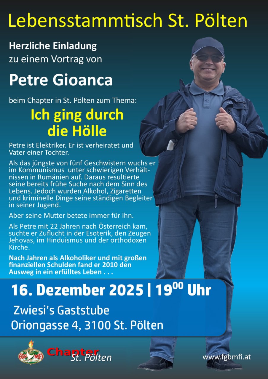 Am: 18. November 2025 von 19:00 bis 21:00 Uhr Ablauf: 19-20 Uhr gemeinsames Abendessen, 20-21 Uhr Lebensbericht … Wo: Restaurant Bokan, Mainersbergstraße 1, 8051 Graz Mit: Christian MANFREDI Zum Thema:[…]
