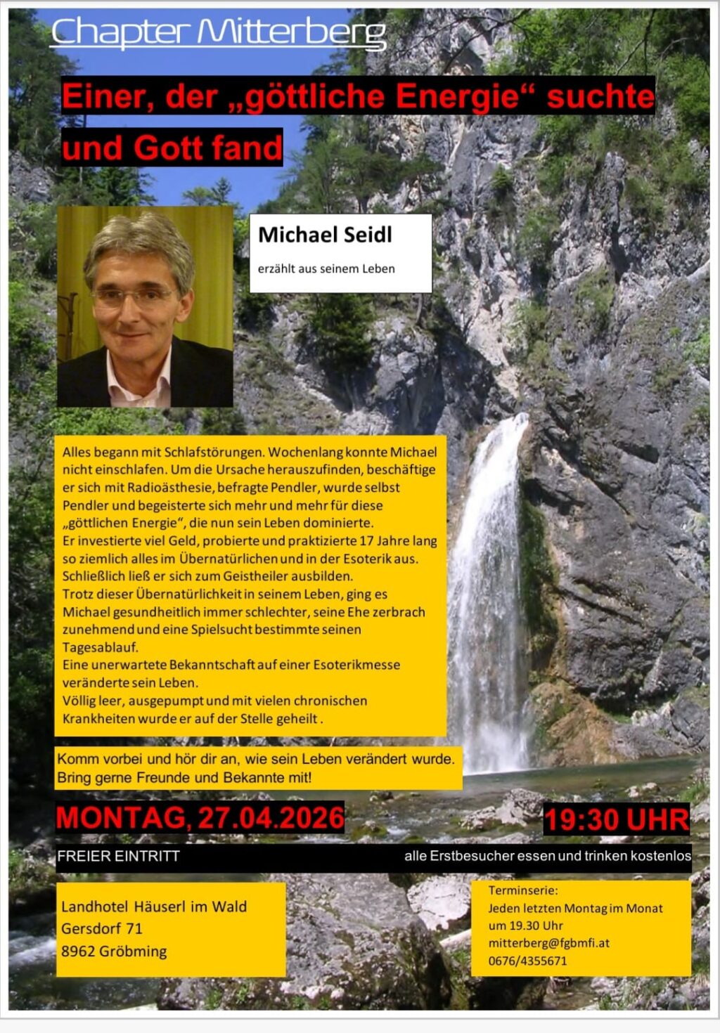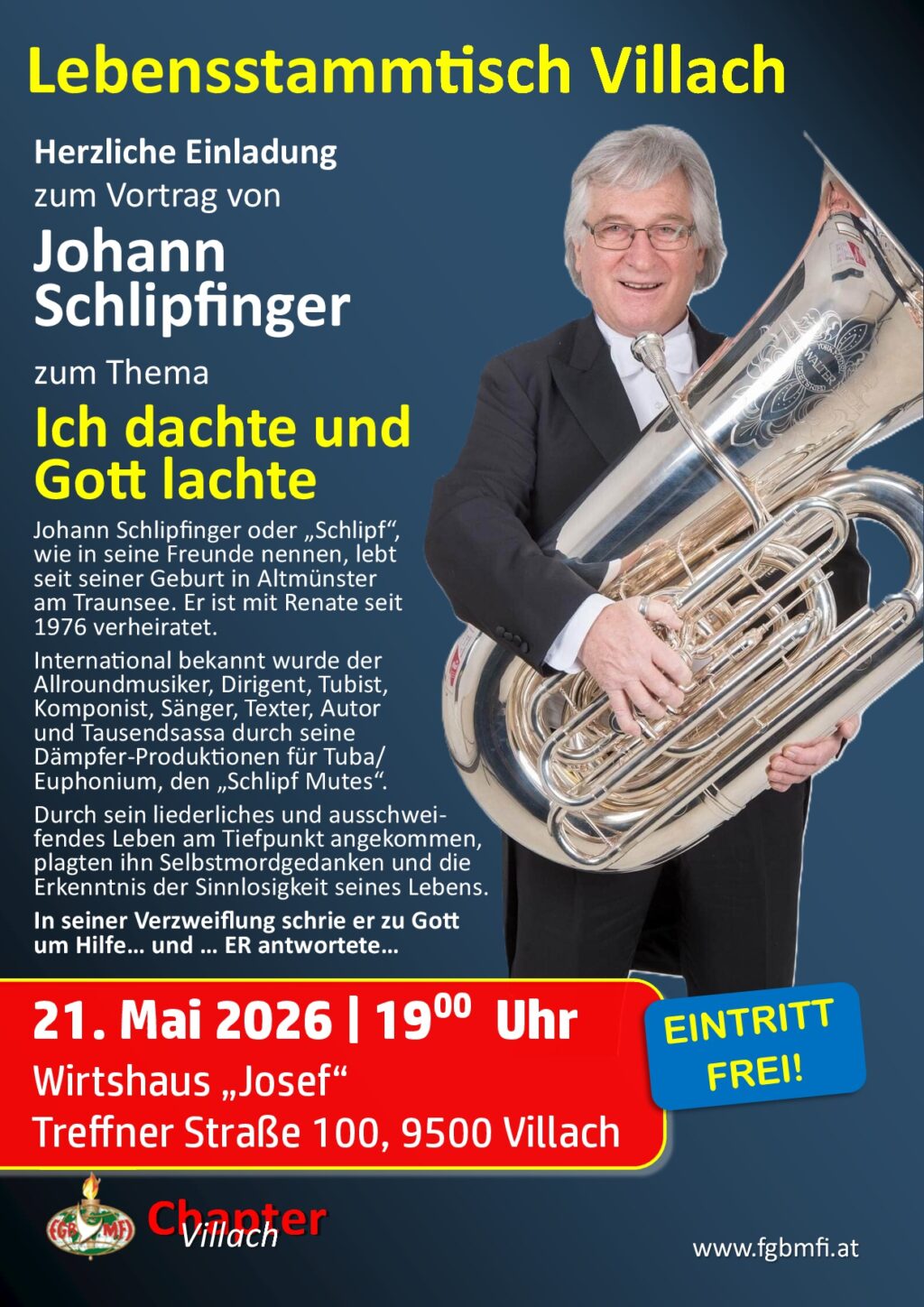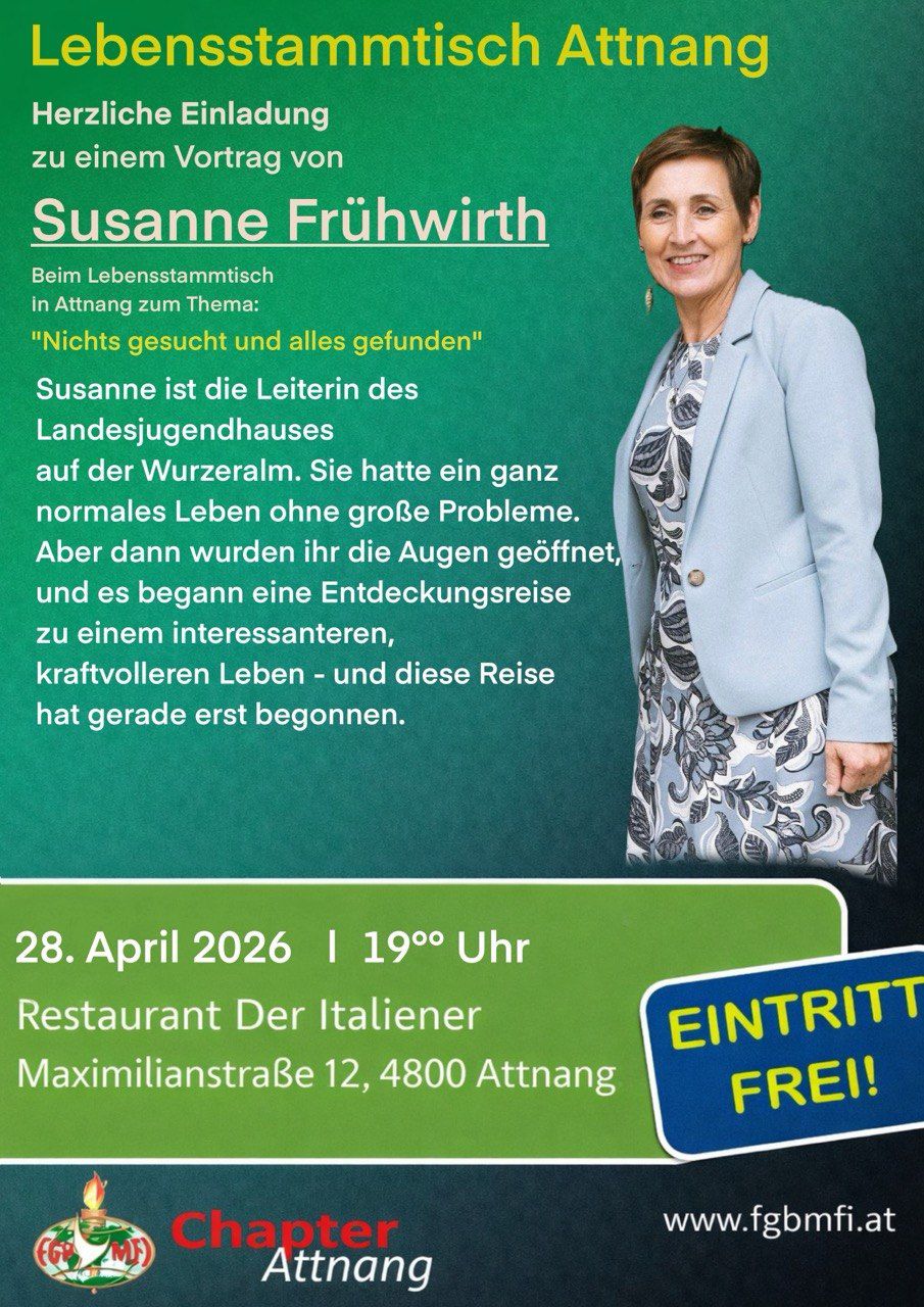 Am: 21. April 2026 von 19:00 bis 21:00 Uhr Ablauf: 19-20 Uhr gemeinsames Abendessen, 20-21 Uhr Lebensbericht … Wo: Restaurant Bokan, Mainersbergstraße 1, 8051 Graz Mit: Thomas Stiasny Zum Thema:[…]