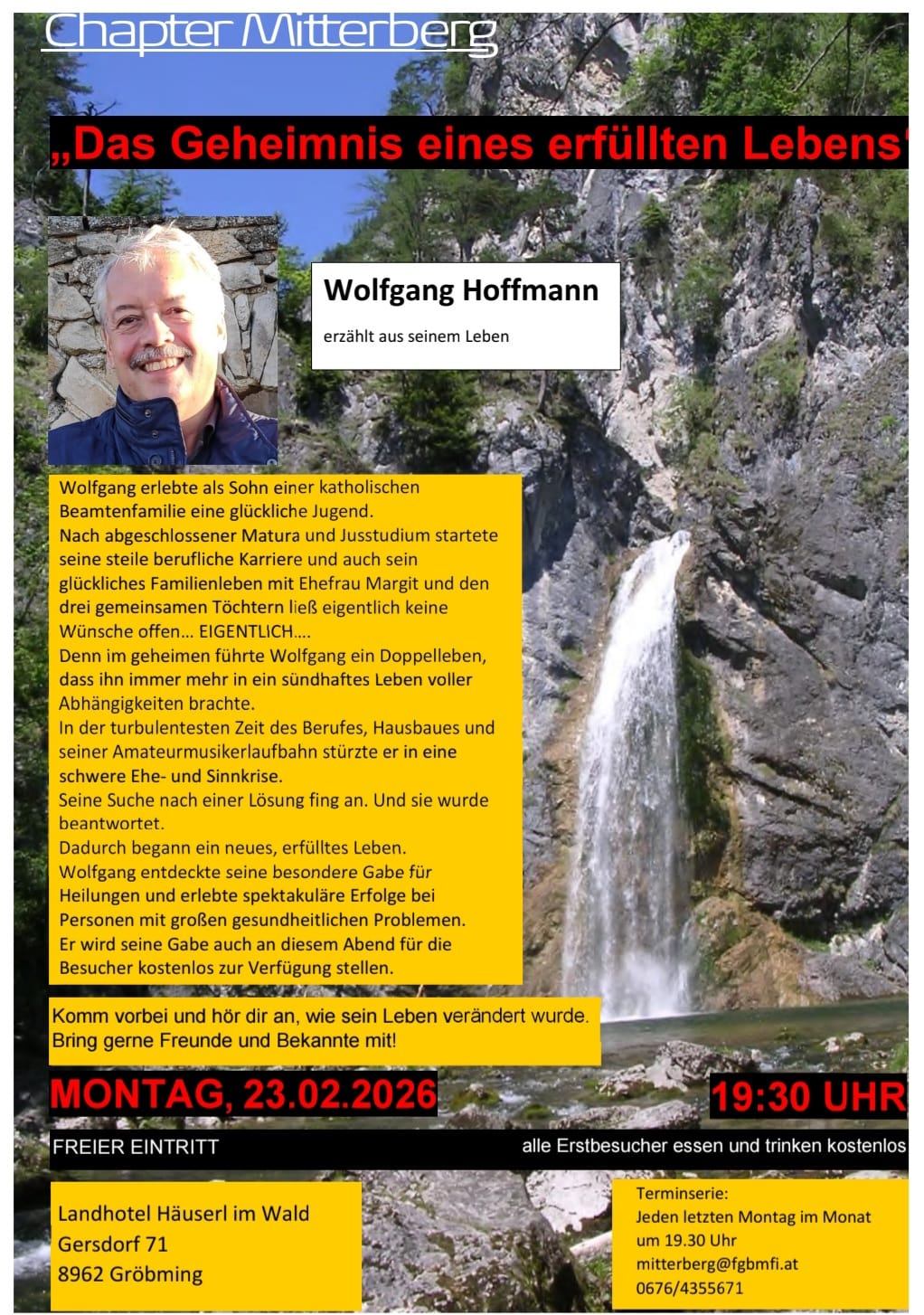 Am: Montag, 23. Februar 2026, 19:30 Uhr —Wo: Landhotel Häuserl im Wald, Gersdorf 71, 8962 Gröbming —