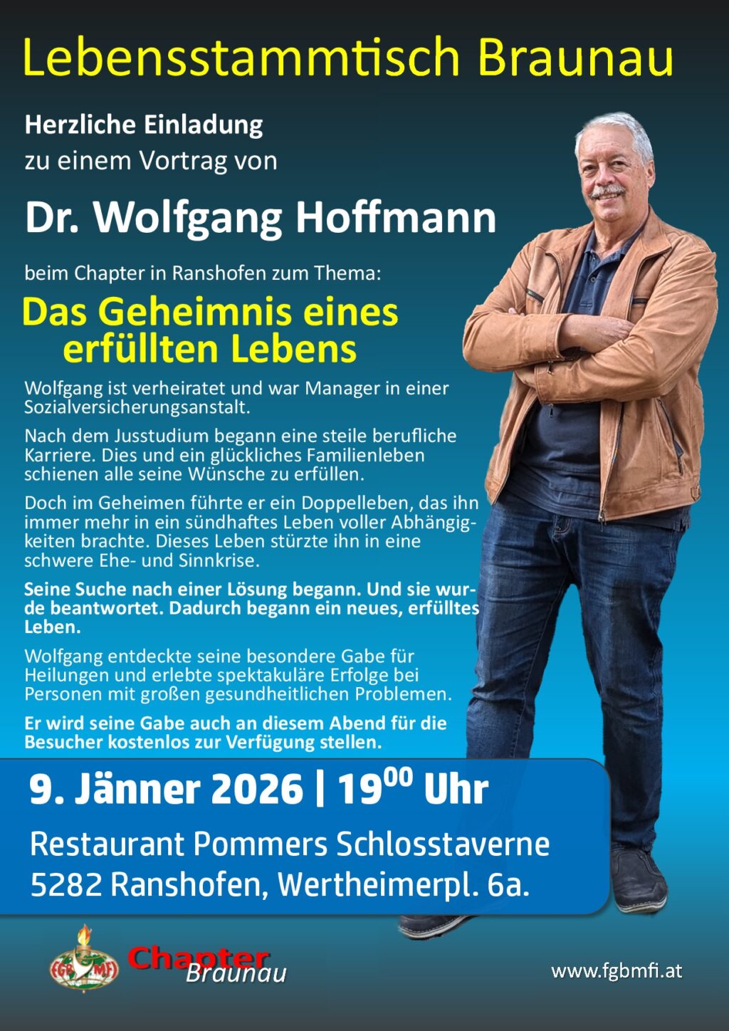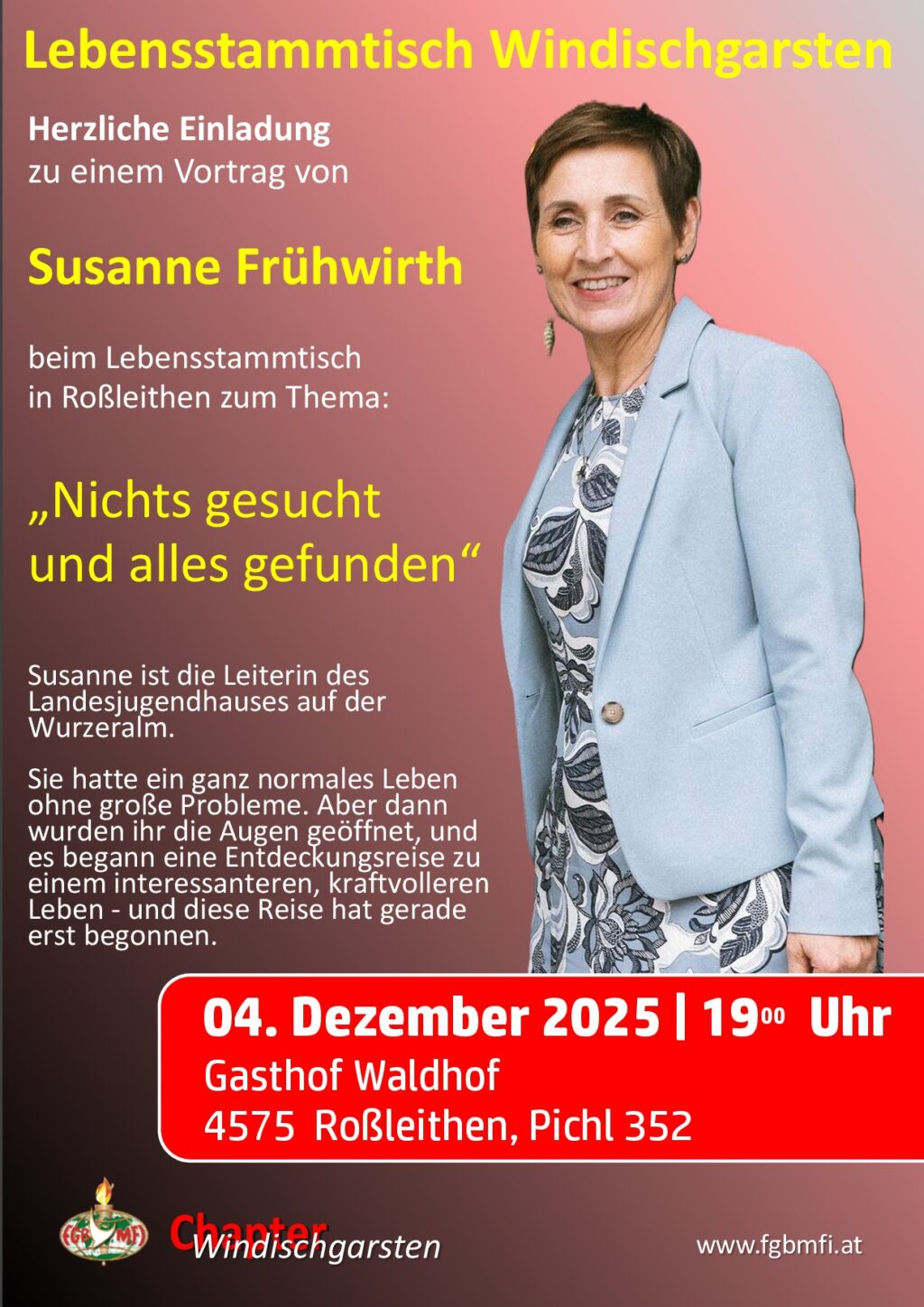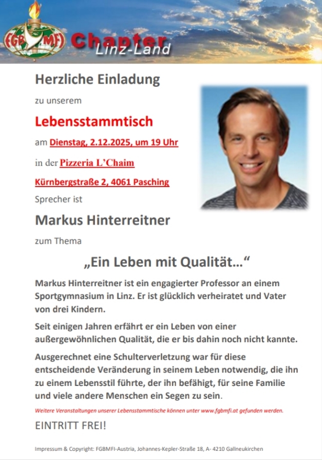 Am: Dienstag, 16.12.2025, 19:00 Uhr — Wo: Puttererseehof Dornbusch, 8943 Aigen im Ennstal 13 — Herzliche Einladung zum Weihnachtschapter-Lebensstammtisch-Abend in Aigen! Aus Dankbarkeit und Freude, laden wir zur gemeinsamen Weihnachtsfeier im Rahmen der Chapterabende des Jahres 2025. Unter dem Motto: „Erzähl mir von deinem Jesus“ erwarten uns mehrere Kurzberichte von Chapterbesuchern, „wie Gott ihnen untakema…