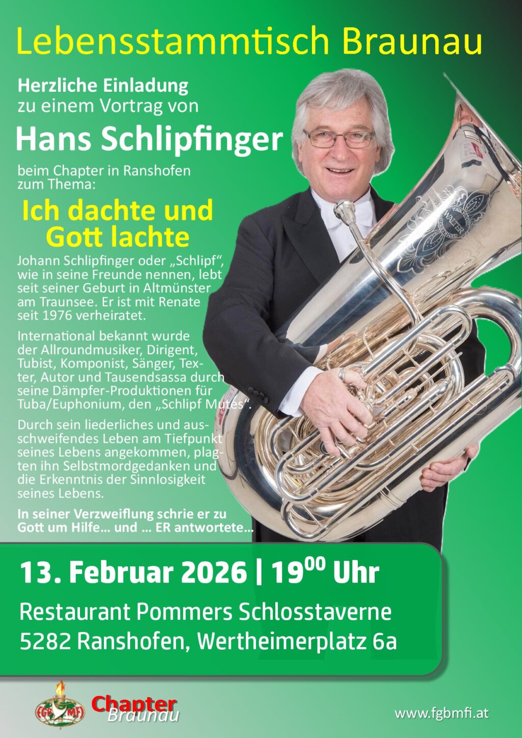 Am:  Samstag, 14. Februar 2026, 09:00 Uhr — Wo: Stadtcafe Leon, Marktplatz 15, 4210 Gallneukirchen — Vom Maschinenbautechniker zum national preisgekrönten Manager in Italien – die steile Karriere von Erwin ließ ihn glauben, alles erreicht zu haben. Doch nach einer Reihe von Rückschlägen hatte er alles verloren und musste das Land verlassen. Da das Leben…
