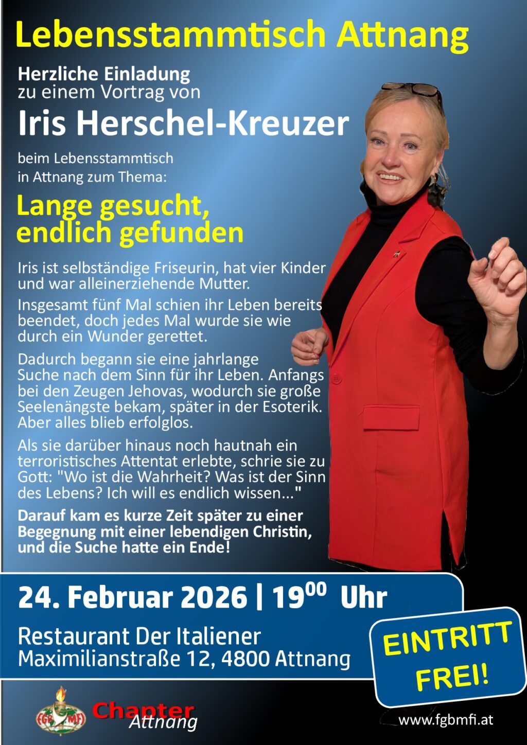 Am: 24. Februar 2026 von 19:00 bis 21:00 Uhr Ablauf: 19-20 Uhr gemeinsames Abendessen, 20-21 Uhr Lebensbericht … Wo: Restaurant Bokan, Mainersbergstraße 1, 8051 Graz Mit: Maria Dallamaßl Zum Thema: Ist das Leben unfair? Sie erlebte ein strenges Elternhaus auch mit Gewalt und der Glaube wurde mit Zwang weitergeben. Mit schulischen Leistungen konnte sie, im…