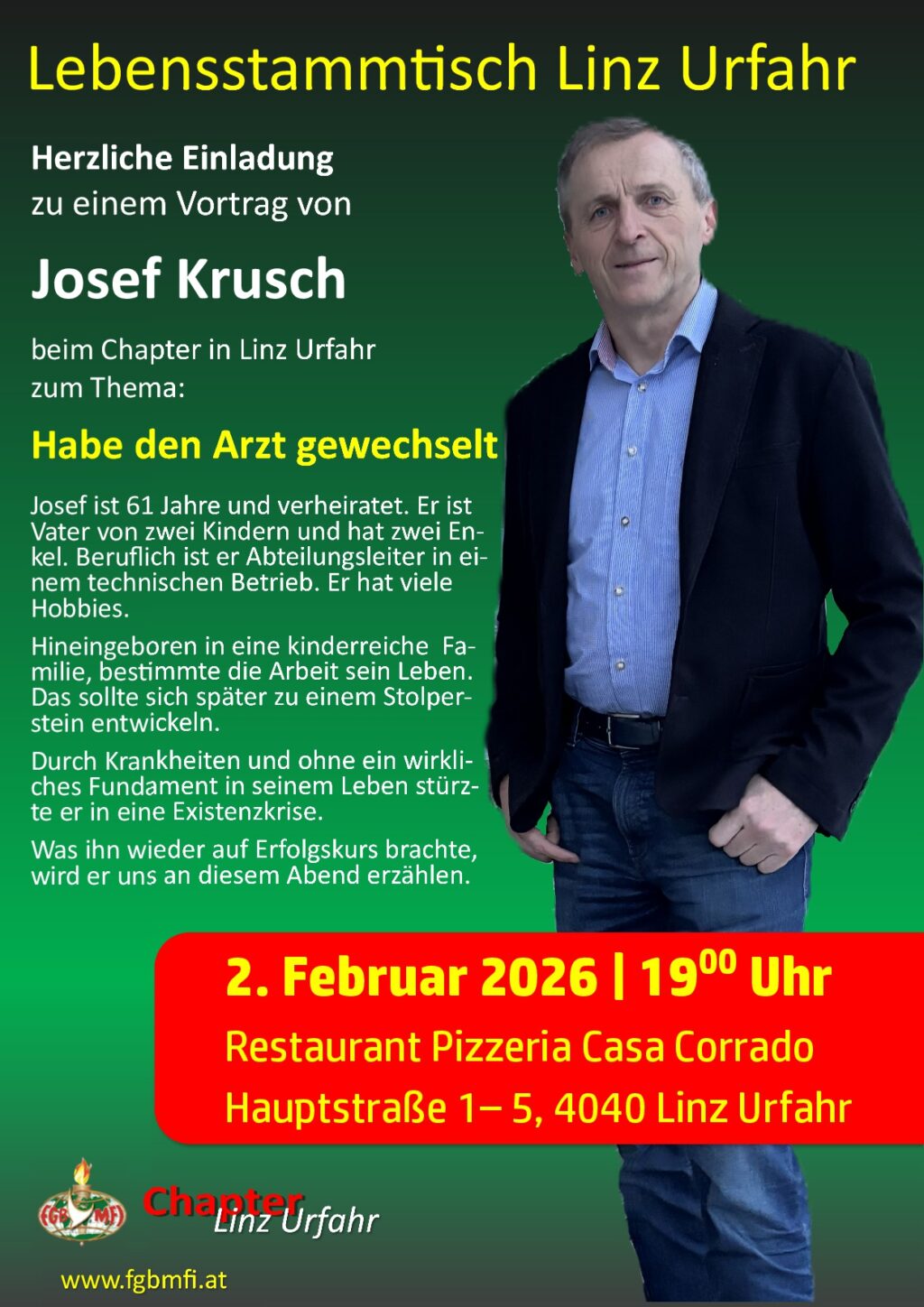 Am: 30. Jänner 2026 um 19:00 Uhr Wo: „H.S.M-Studio“, Wartbergerstr.6 4542 Nußbach Josef war Workaholiker und stand vor dem Burnout. Seine ganze Familie litt darunter. Mit 44 Jahren hatte er ein besonderes Erlebnis, das ihn und seine Frau schlagartig veränderte. Sie fanden dadurch zur inneren Ruhe und einem unbeschreiblichen Frieden…