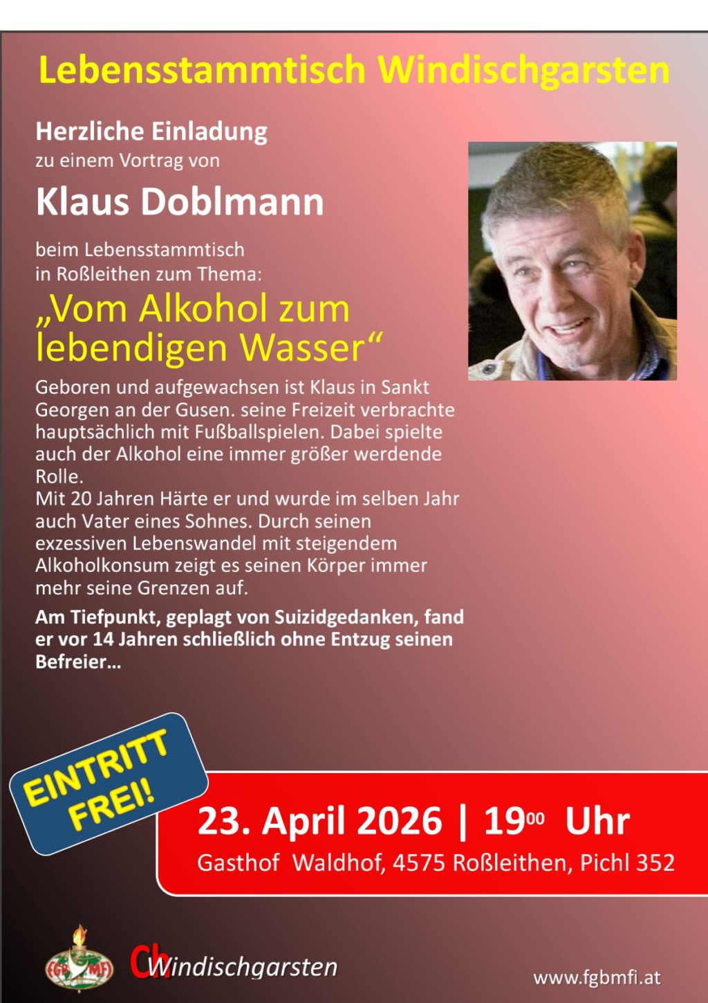 Am: 21. April 2026 von 19:00 bis 21:00 Uhr Ablauf: 19-20 Uhr gemeinsames Abendessen, 20-21 Uhr Lebensbericht … Wo: Restaurant Bokan, Mainersbergstraße 1, 8051 Graz Mit: Thomas Stiasny Zum Thema: Erfüllung statt Fülle Thomas leitet mehrere Handwerksbetriebe mit insgesamt 30 Mitarbeitern. Verheiratet ist er mit Sanna, einer Finnin. Gemeinsam haben sie fünf Kinder. Katholisch aufgezogen,…