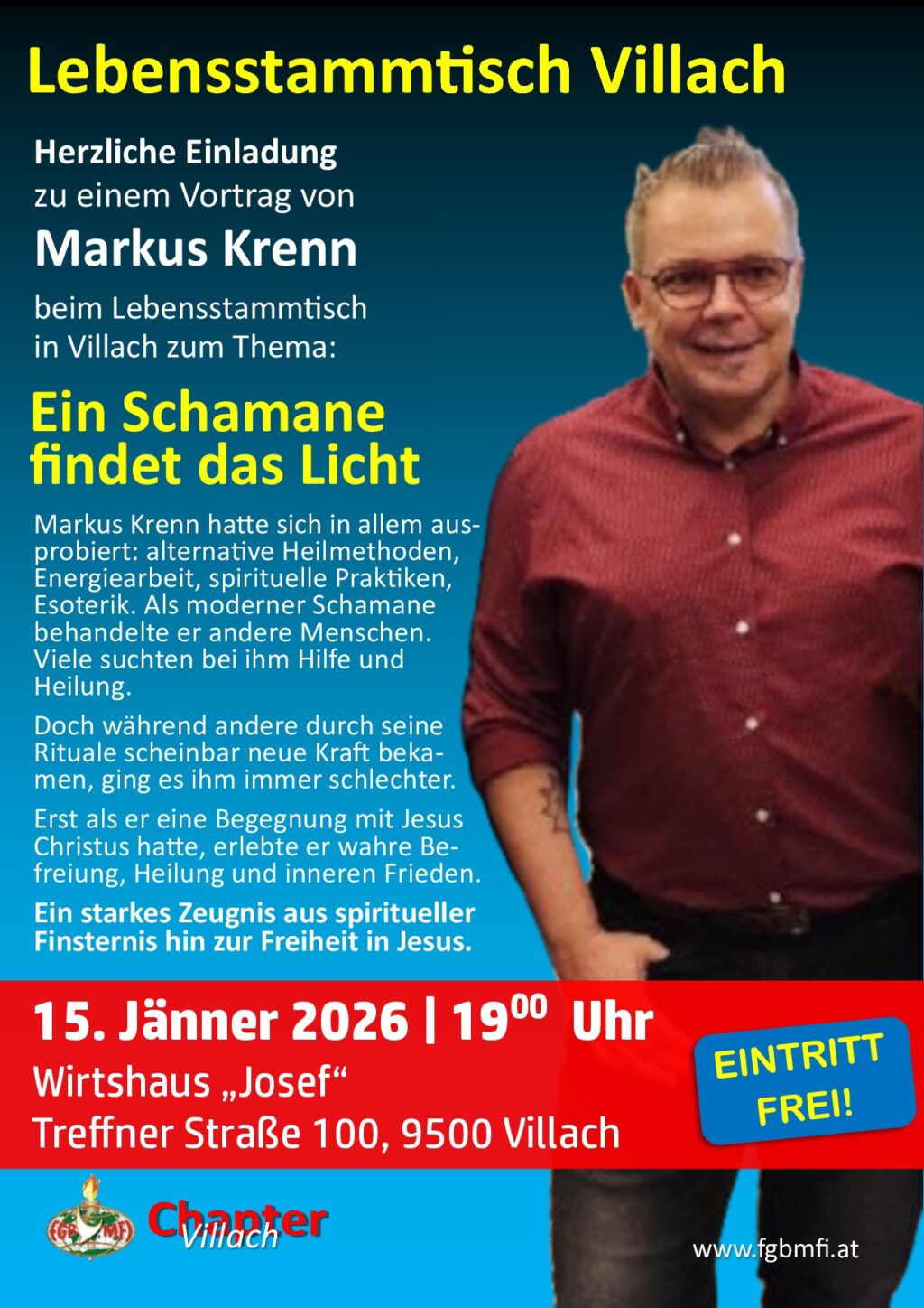 Am: Dienstag, 16.12.2025, 19:00 Uhr — Wo: Puttererseehof Dornbusch, 8943 Aigen im Ennstal 13 — Herzliche Einladung zum Weihnachtschapter-Lebensstammtisch-Abend in Aigen! Aus Dankbarkeit und Freude, laden wir zur gemeinsamen Weihnachtsfeier im Rahmen der Chapterabende des Jahres 2025. Unter dem Motto: „Erzähl mir von deinem Jesus“ erwarten uns mehrere Kurzberichte von Chapterbesuchern, „wie Gott ihnen untakema…