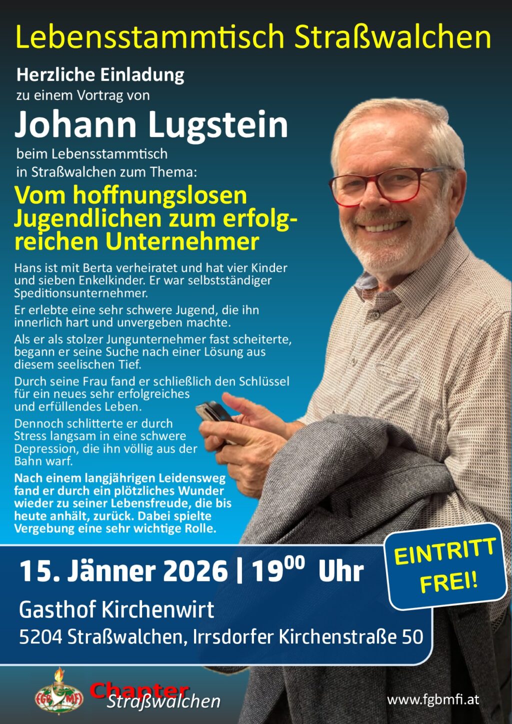 Am: 20. Jänner 2026 von 19:00 bis 21:00 Uhr Ablauf: 19-20 Uhr gemeinsames Abendessen, 20-21 Uhr Lebensbericht … Wo: Restaurant Bokan, Mainersbergstraße 1, 8051 Graz Mit: Johann Schlipfinger Zum Thema: Ich dachte und Gott lachte Johann Schlipfinger, oder „Schlipf“ wie in seine Freunde nennen, lebt seit seiner Geburt 1951 in Altmünster am Traunsee. Er ist…
