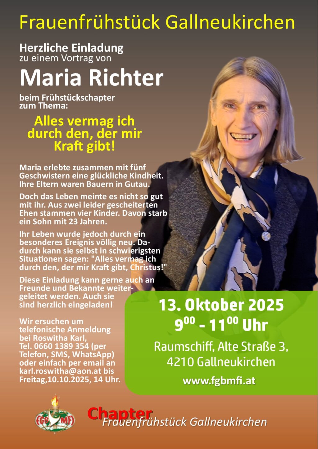 Am: Freitag, 3.10.2025, 09.00 Uhr —Wo: Landhotel Puttererseehof, 8943 Aigen 13 Bruni ist alleinstehend, lebt in Schladming und hat eine Tochter und eine Enkelin. Sie war 40 Jahre Krankenschwester mit Leidenschaft, sehr begabt und wertgeschätzt in ihrem Beruf. In jungen Jahren führte sie ein „ halli/galli “ Leben. Ihr Motto war, man sollte Menschen nehmen,…