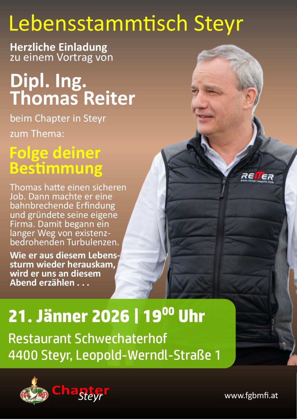 Am: 20. Jänner 2026 von 19:00 bis 21:00 Uhr Ablauf: 19-20 Uhr gemeinsames Abendessen, 20-21 Uhr Lebensbericht … Wo: Restaurant Bokan, Mainersbergstraße 1, 8051 Graz Mit: Johann Schlipfinger Zum Thema: Ich dachte und Gott lachte Johann Schlipfinger, oder „Schlipf“ wie in seine Freunde nennen, lebt seit seiner Geburt 1951 in Altmünster am Traunsee. Er ist…